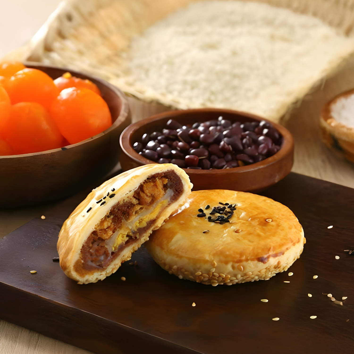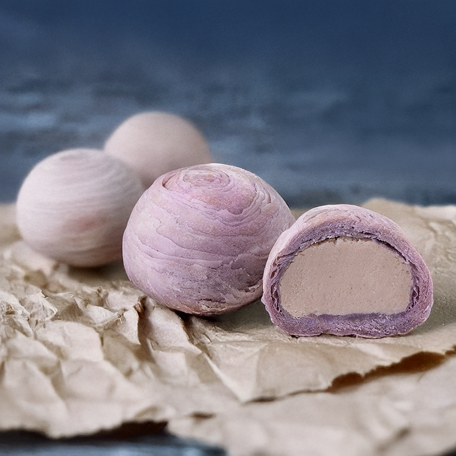 若說太陽餅是光,那芋頭酥便是大地的饋贈。選用台灣頂級的檳榔心芋,蒸熟後手工壓製成泥,保留部分芋頭的顆粒感,以增添豐富的食感。外皮同樣展現了寶泉的開酥絕技,一層層的紫色與白色麵皮交織,螺旋上升,形似一朵含苞待放的玫瑰。當你輕輕掰開,內餡的芋泥醇厚香濃,外皮的酥脆與內餡的軟糯形成對比,芋頭的天然香氣在口中久久不散。這不僅是一款點心,更是一件可食用的藝術品。